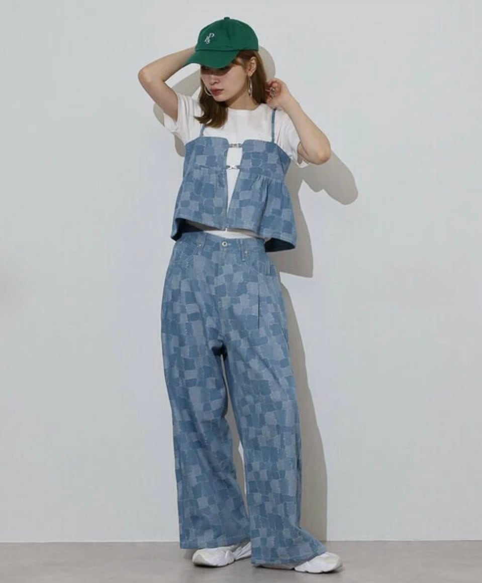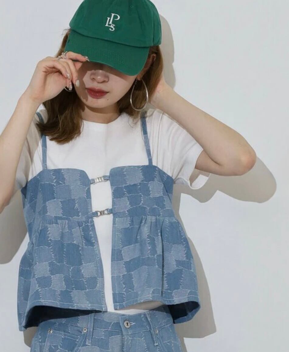 パッチワーク風デザインで旬顔に仕上がる主役級ビスチェ。凹凸のある織り柄で、ヴィンテージライクな雰囲気を演出するパッチワーク風デニムビスチェ。
