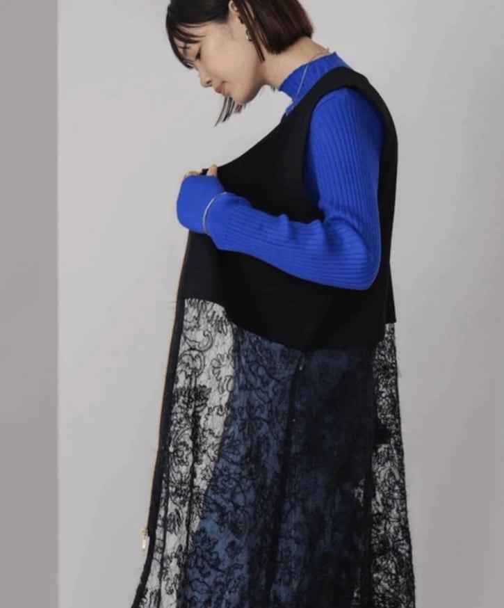 いつものスタイルに羽織るだけで、トレンド感と女性らしさをプラスしてくれるレースジレが登場!ウエストから広がるレースは、軽やかさの中にデコラティブな表情を持ち、さりげなくあしらわれたスパンコールが動くたびにきらりと輝きます。Tシャツやカットソーに合わせてカジュアルに、ブラウスやニットに重ねてエレガントに。インナー次第で長い季節活躍し、シンプルなコーデも一気にクラスアップして見せてくれます。大人の女性にぴったりの“華やぎプラスワンアイテム”として、この秋冬のワードローブに加えたい一枚です。