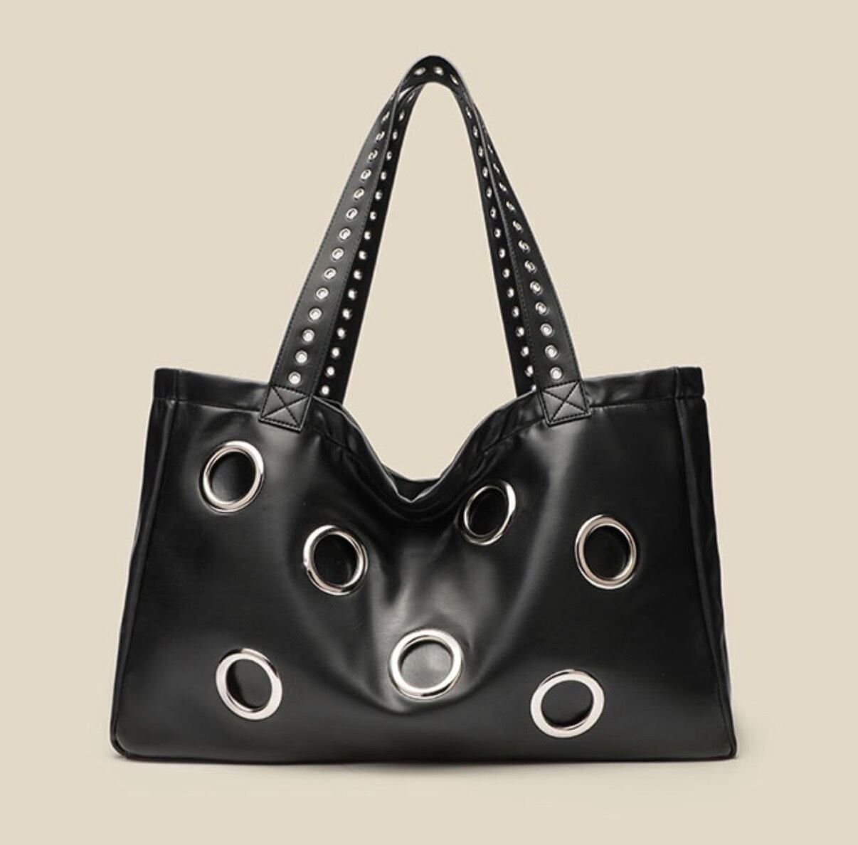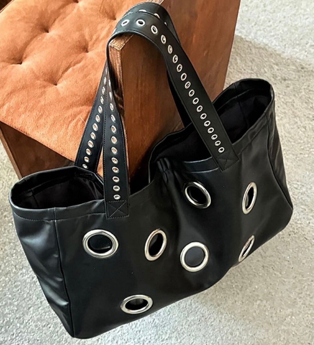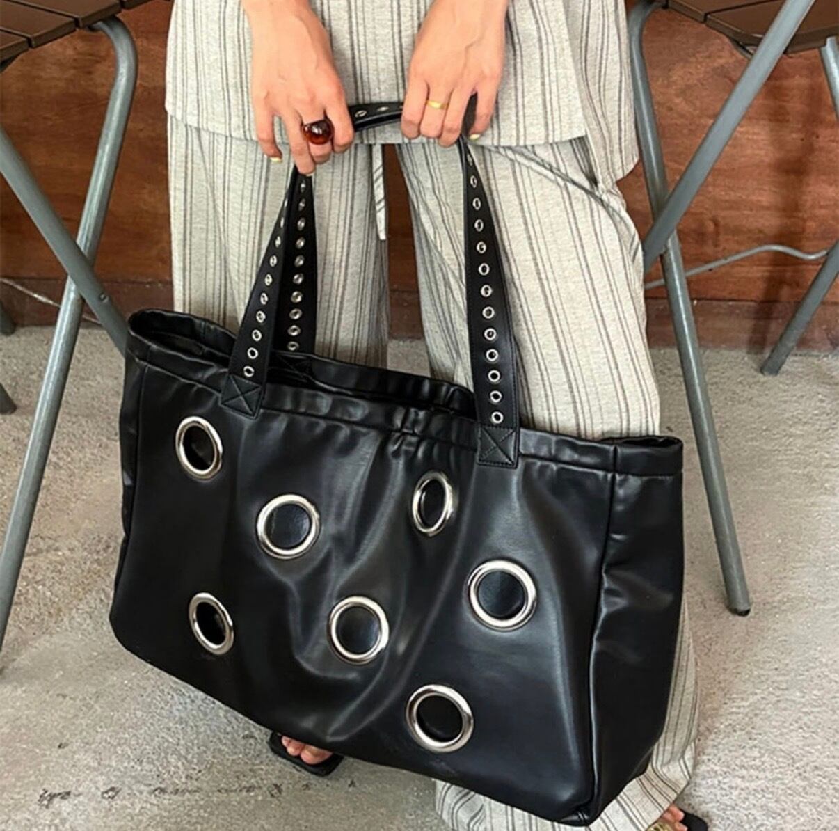 Eyelet Decoration Tote Bag スタッズをあしらったパンクテイストの大容量トートバッグ。程よいヴィンテージ感と無骨なデザインで存在感を放ちます。 荷物がたくさん入る大きめのサイズ感や、肩掛け・手持ちの両方で使える実用性の高いアイテムです。 【サイズ】 縦:32cm 横:49cm マチ:14cm ショルダーストラップ:32cm ※採寸方法により2〜3cmの誤差がある場合がございます。 ◼︎カラー ブラック ◼︎素材 pu