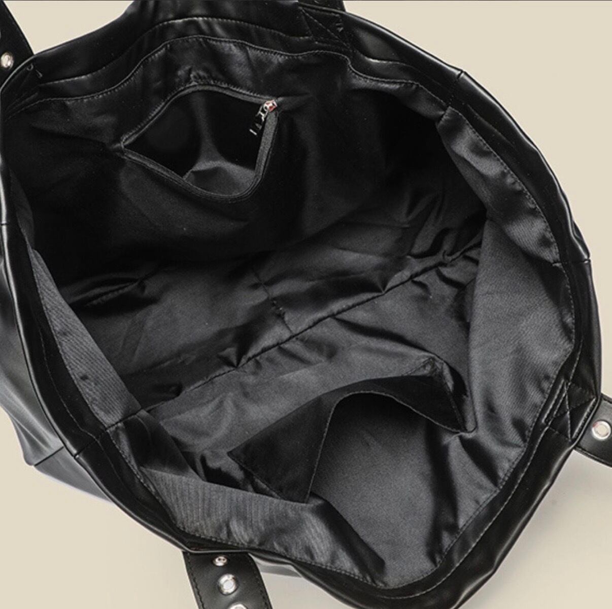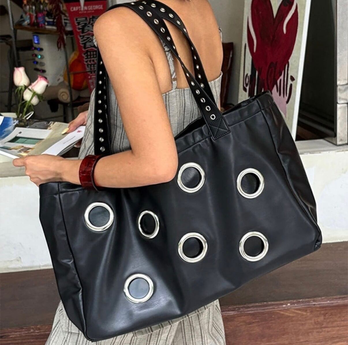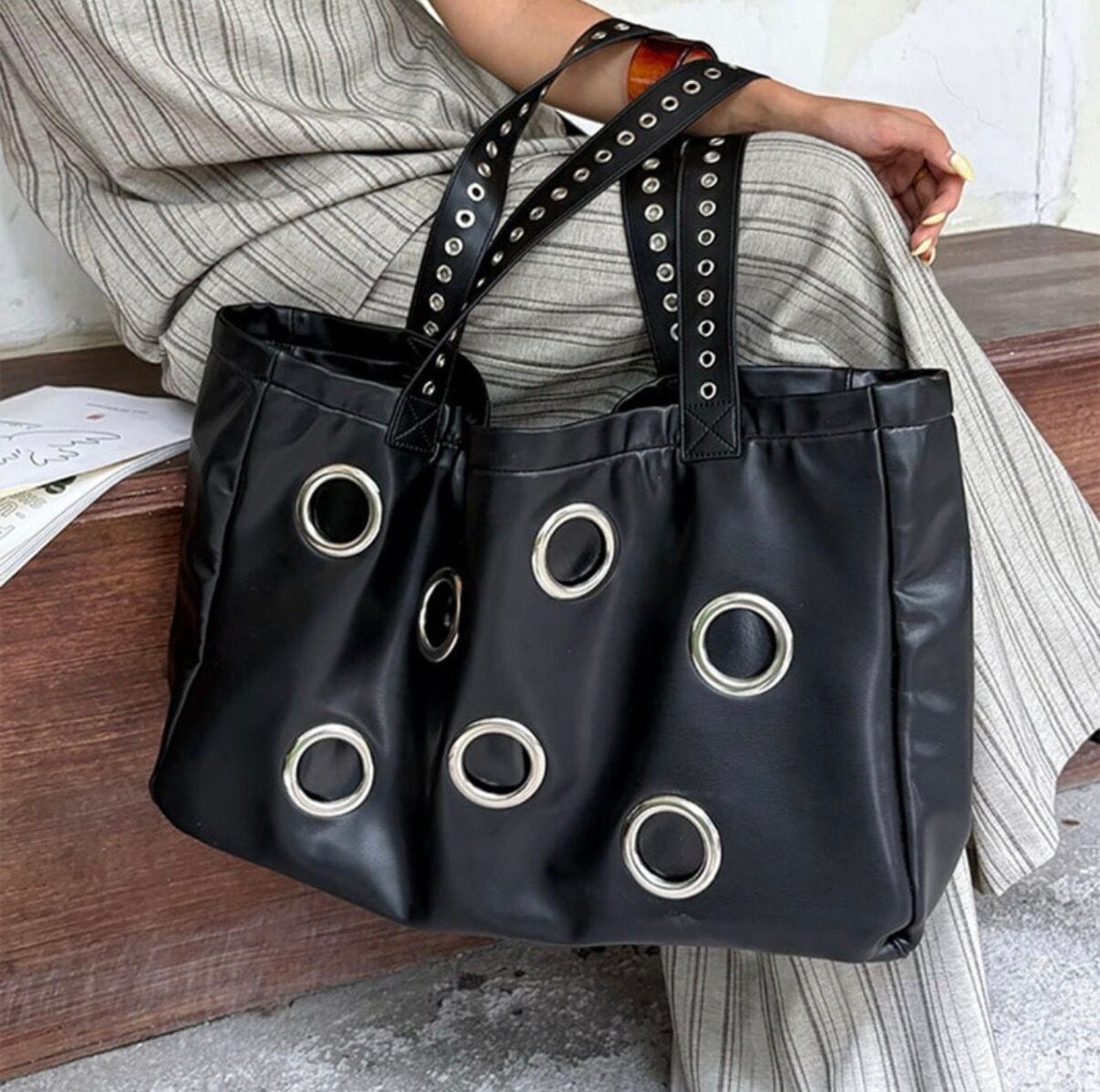 Eyelet Decoration Tote Bag スタッズをあしらったパンクテイストの大容量トートバッグ。程よいヴィンテージ感と無骨なデザインで存在感を放ちます。 荷物がたくさん入る大きめのサイズ感や、肩掛け・手持ちの両方で使える実用性の高いアイテムです。 【サイズ】 縦:32cm 横:49cm マチ:14cm ショルダーストラップ:32cm ※採寸方法により2〜3cmの誤差がある場合がございます。 ◼︎カラー ブラック ◼︎素材 pu