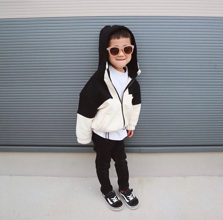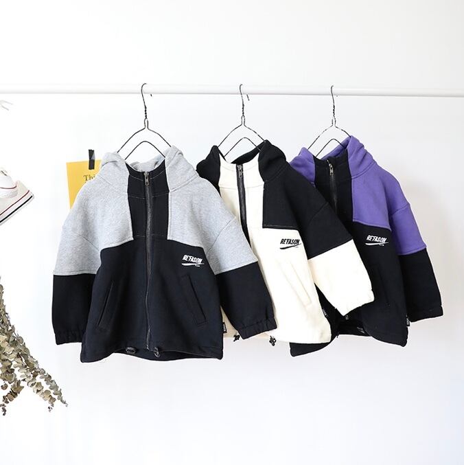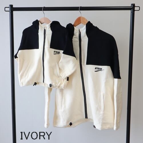 バイカラーがポイントのフロントジップパーカー。ユニセックスで着て頂けるスポーティなアイテムです。ママとのリンクコーデもおすすめな一枚です。