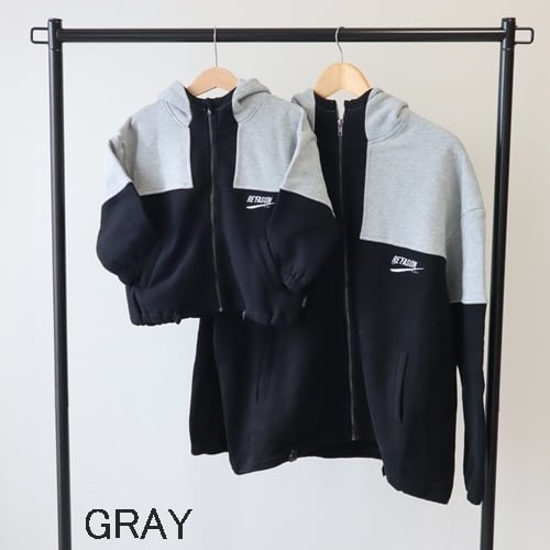 バイカラーがポイントのフロントジップパーカー。ユニセックスで着て頂けるスポーティなアイテムです。キッズとのリンクコーデもおすすめな一枚です。