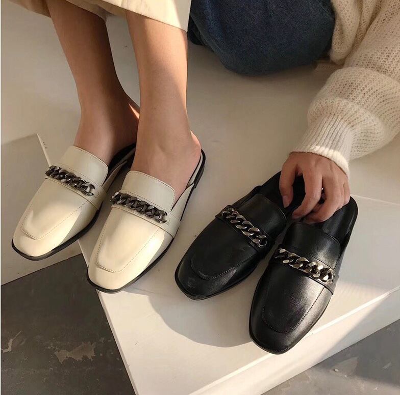 シンプルながらもチェーンパーツがアクセントになったお洒落見えするシューズ。バックレスタイプでかかとずれの心配もなくローファーよりも履きやすく、サンダルよりもきちんと感が出るので色々な場面で活躍してくれます◎革靴特有のムレなども気にせずに履けるのもポイント◎