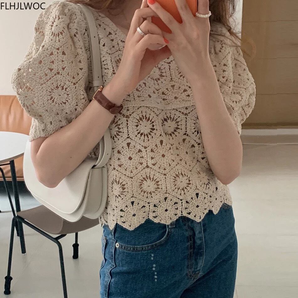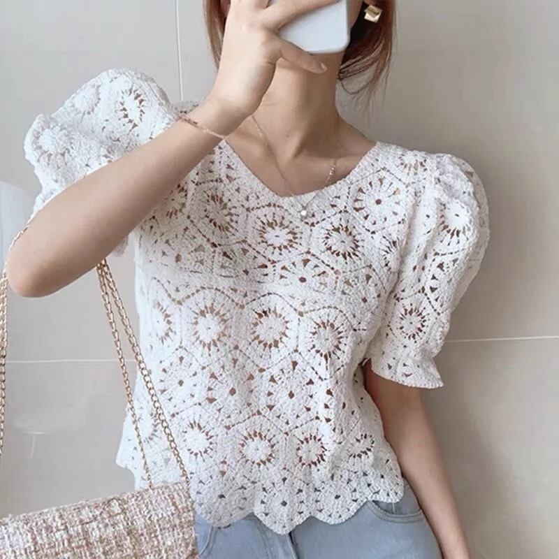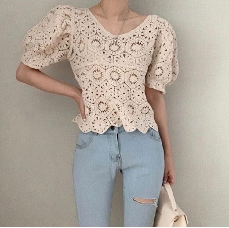 クロシェ編みデザインとパフスリーブのボリューム袖が可愛いデザイントップス。キャミワンピースなどの上にレイヤードしても可愛いです。
