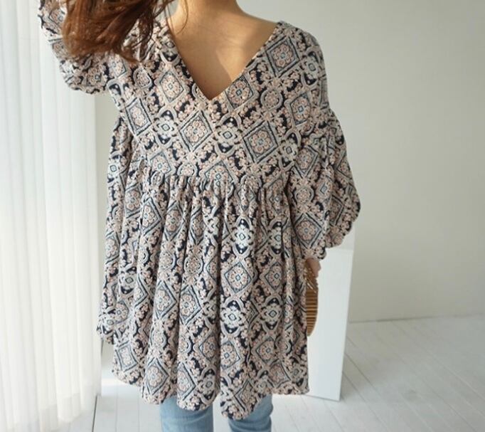 バルーン袖/エスニックブラウス/チュニック/ゆったりトップス/韓国ファッション/ロング丈
