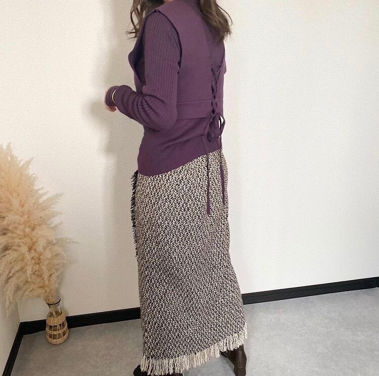 こなれ感のでるビスチェセットアイテム。フロントは深いVネックにし、サイドを開ける事によって抜け感があり大人な印象に。後ろのさりげないレースアップがポイントです。ビスチェとリブニット、別々でも着用頂けます。