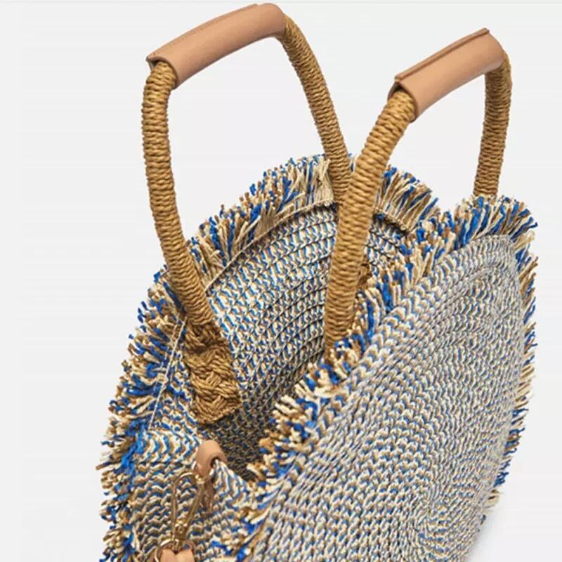 縁にフリンジをあしらったデザインがかわいいバッグ。取り外し可能なショルダーもついているので2wayで使用する事ができます。