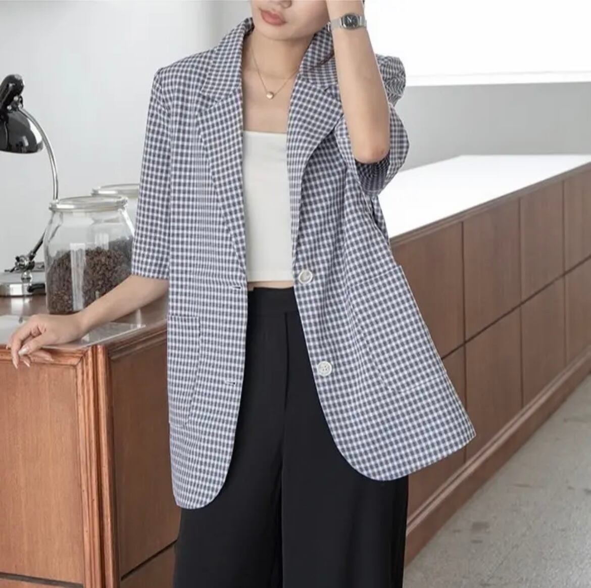 ギンガムチェックとオーバーサイズのシルエットが今っぽいサマージャケット。パッと目を引く一着です。