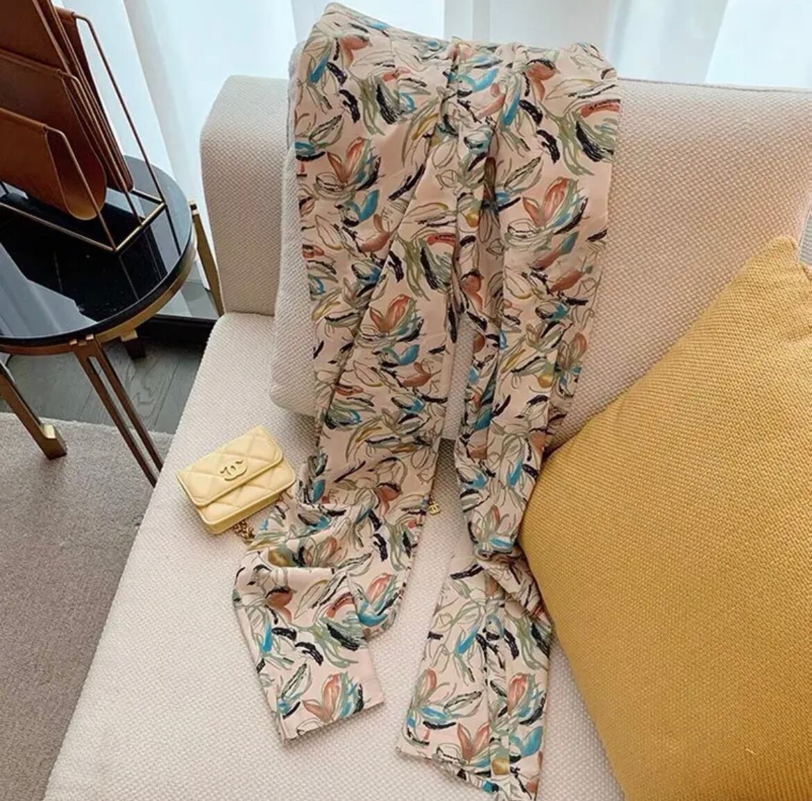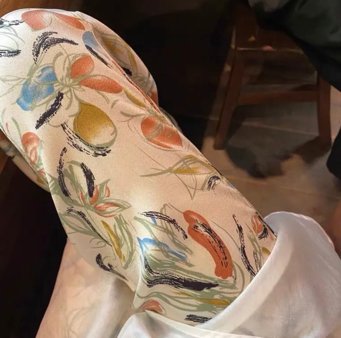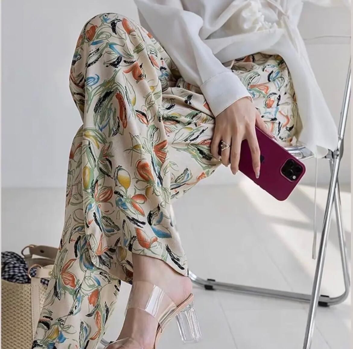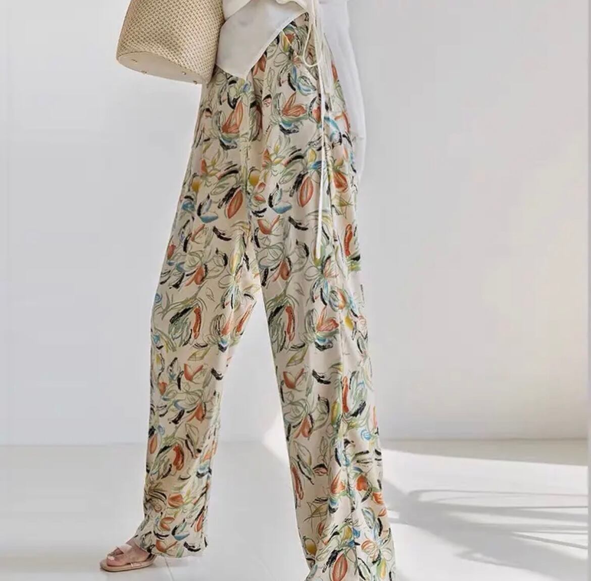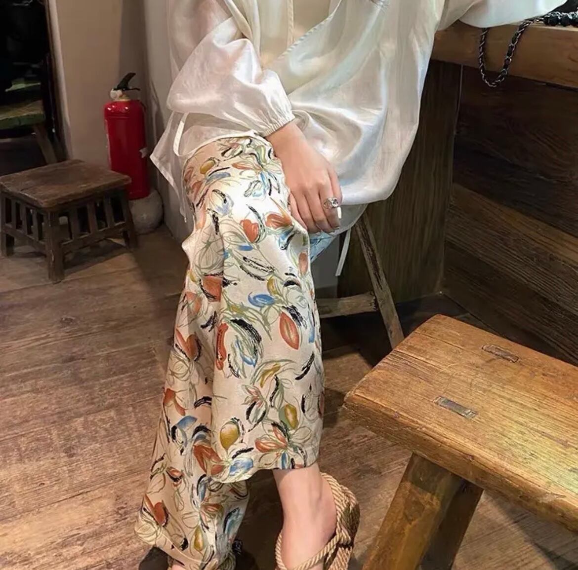 レトロなフラワーデザインが可愛いパンツ。軽い生地感で、履き心地もよく見た目にも美しい。シンプルなトップスやシャツとの相性も◎