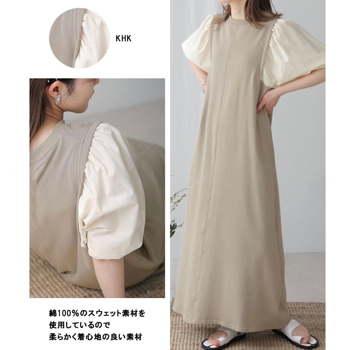 お袖がポワンとなった1枚でおしゃれになるワンピース。ボリュームのある袖と、自然なフレアラインが、女性らしい印象にまとめてくれるのが魅力。身頃はスウェット素材でカジュアルですが、お袖はシャツ地を使うことによってきちんと感が出ます。センター部分にあえてステッチを見せているのもポイント。後ろには深めのスリットをいれることで抜け感も出ます。お袖の部分が配色になっているのもポイントです。