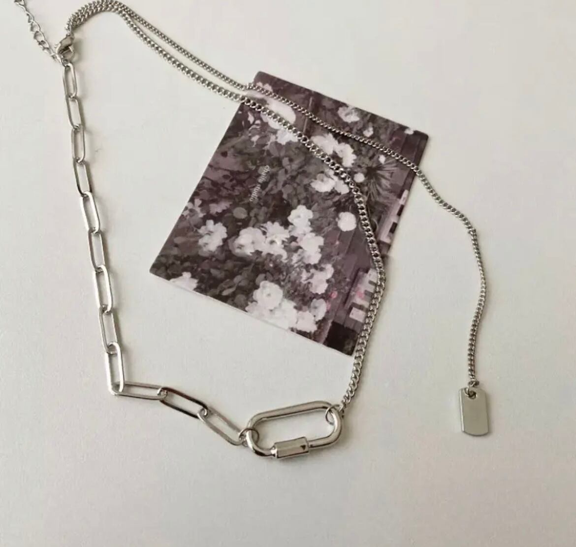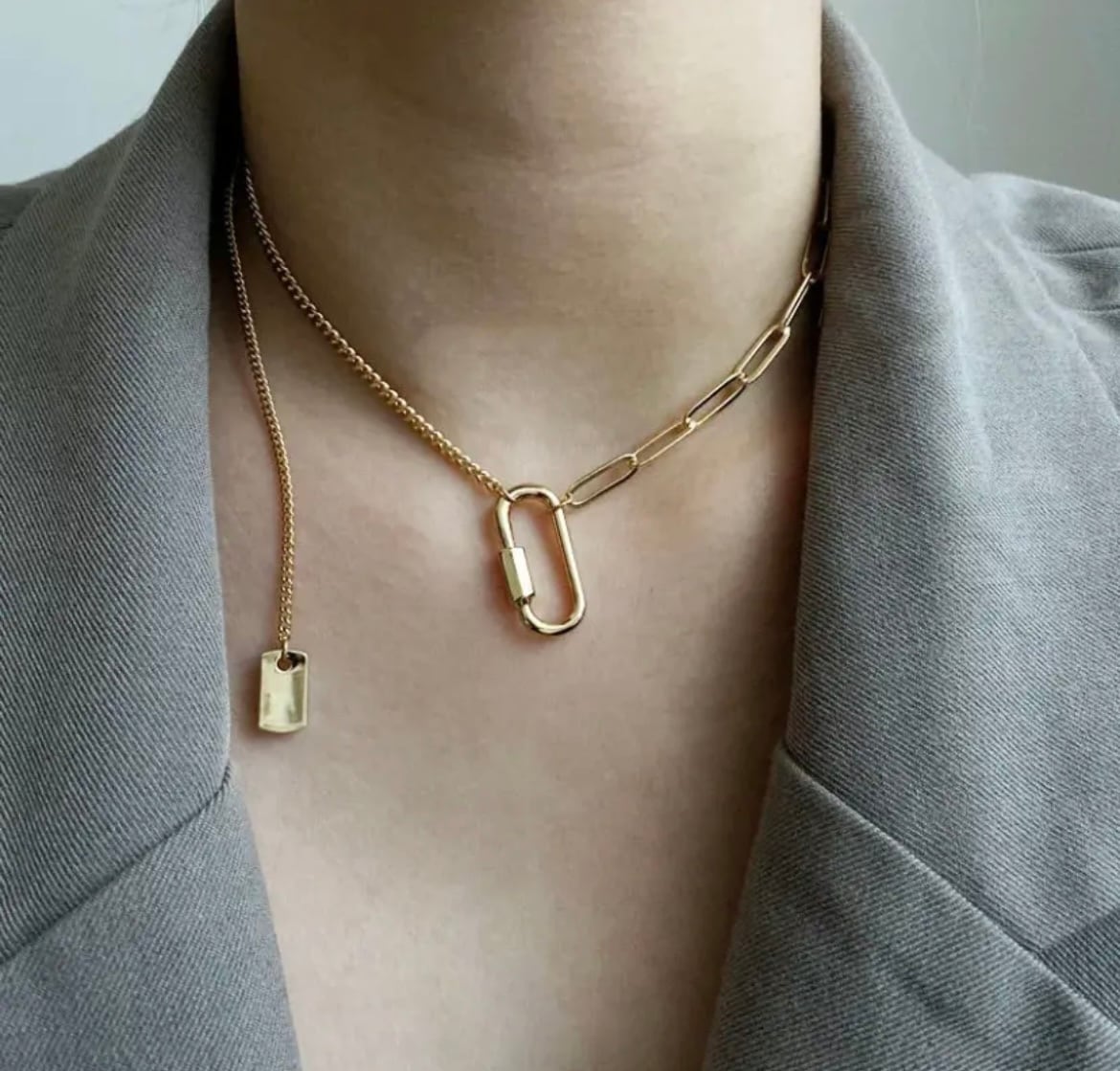 2種類のチェーンがおしゃれなネックレス。クリップのような小さめのワンポイントデザインがどんなスタイルにも合うお勧めトレンドアイテムです。