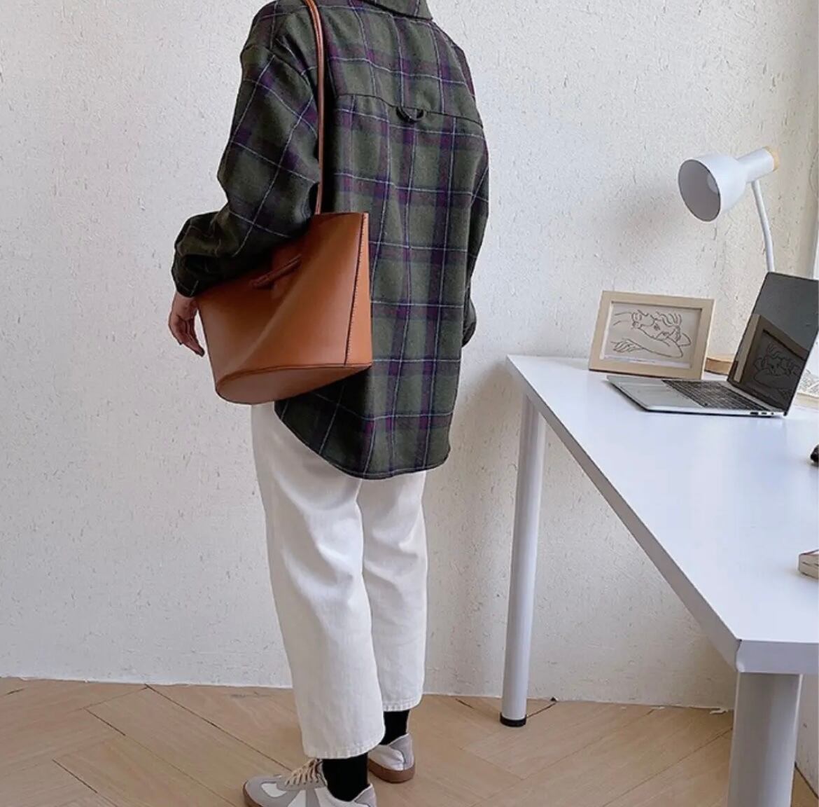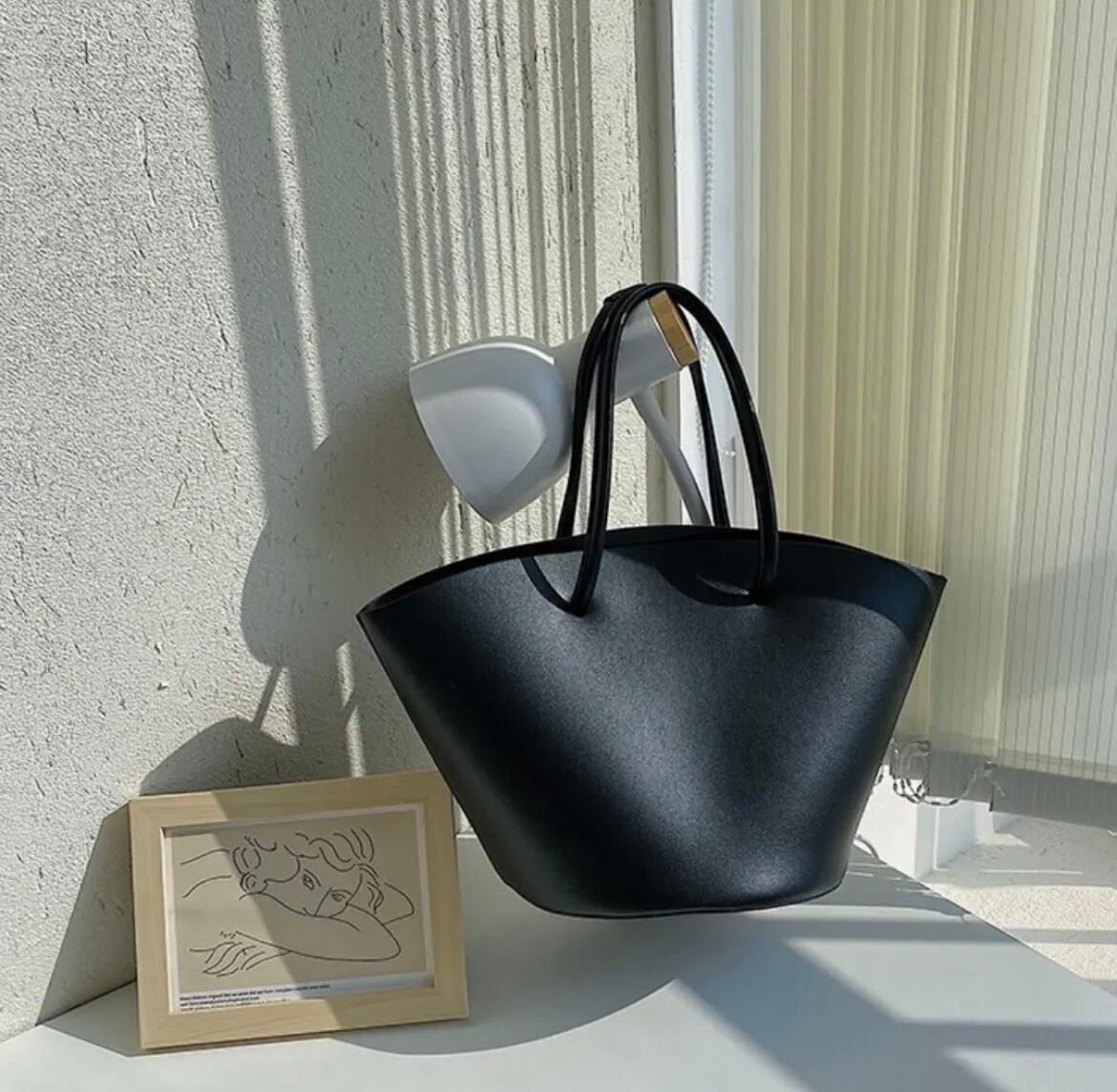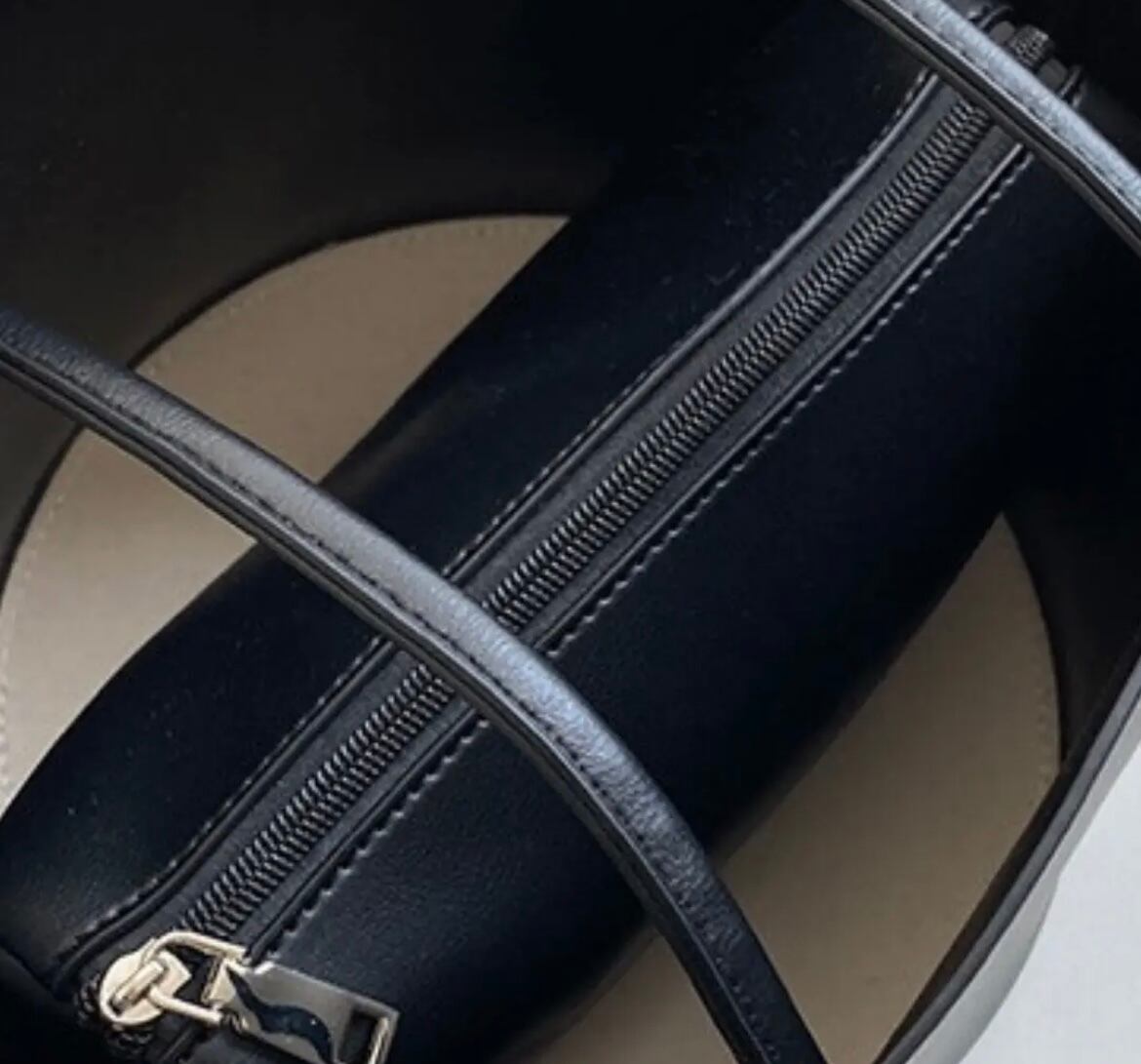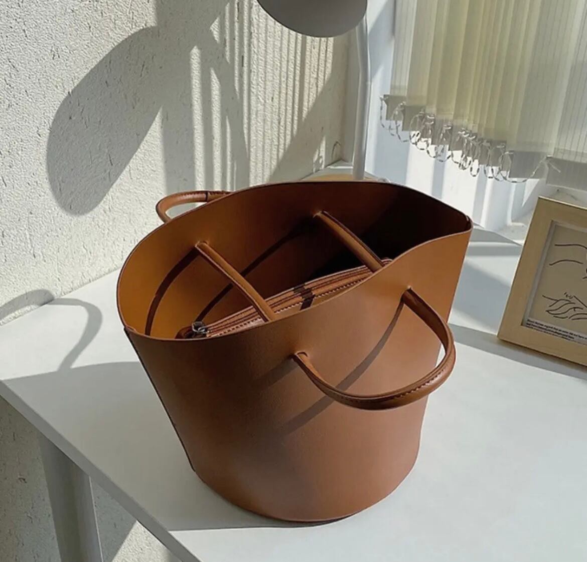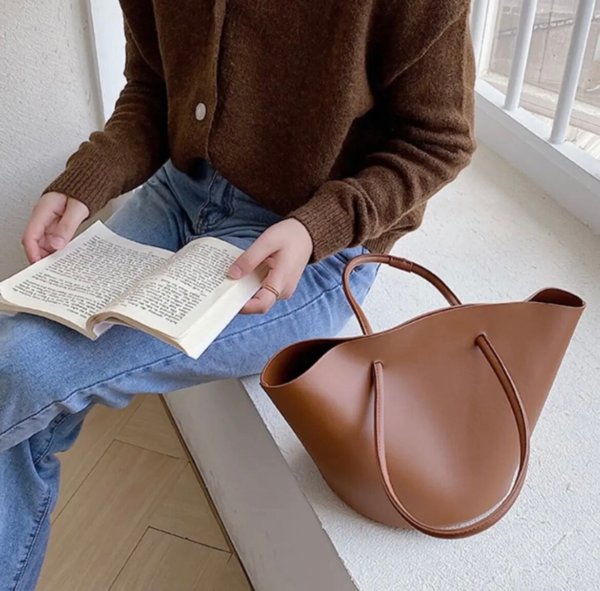 カジュアルにも綺麗めにも合うシンプルなハンドバッグ。バッグインポーチでデザイン性も◎