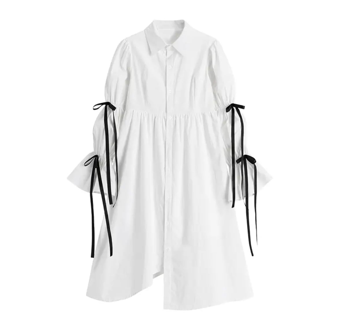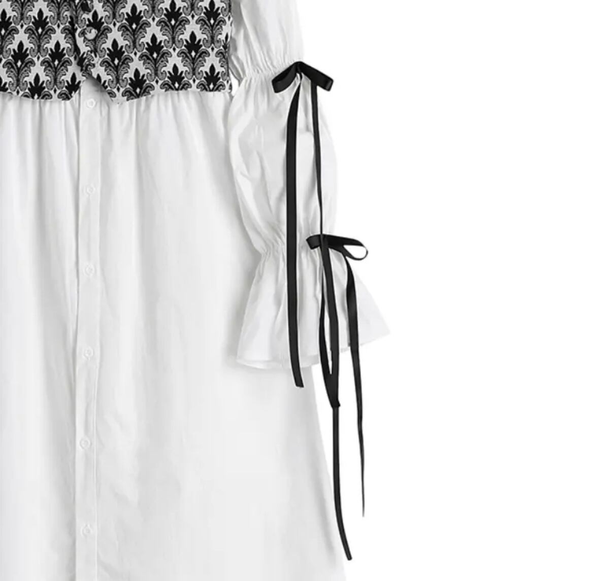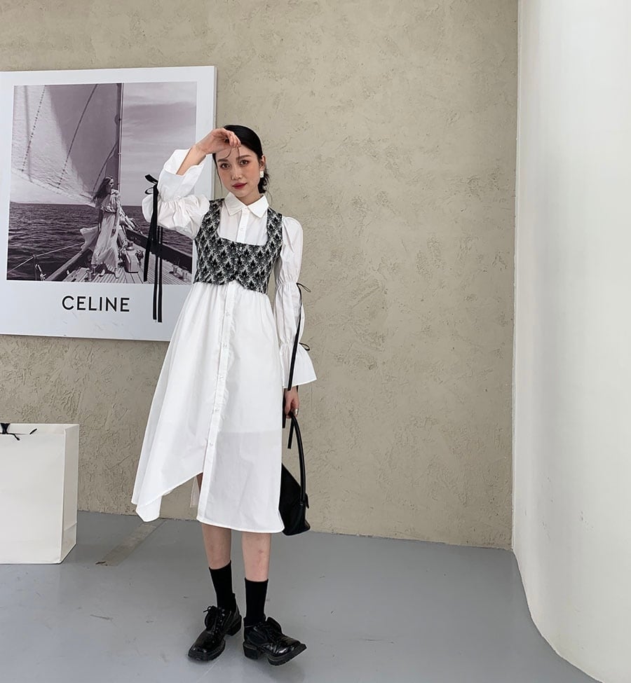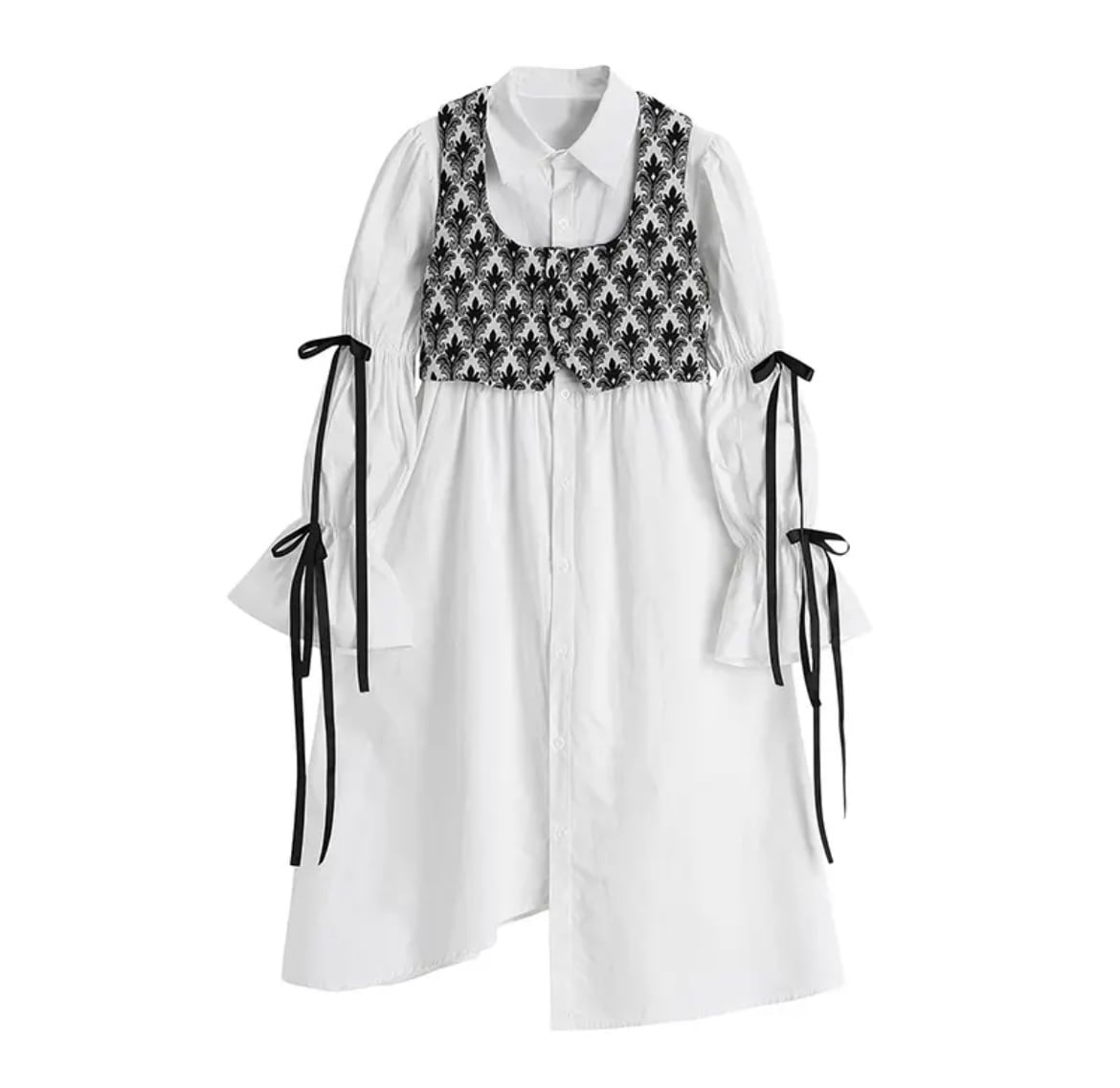 シャツワンピースとニットベストの2点セットです。ボリューム袖とリボンがポイントのワンピースとのレイヤードが楽しめます。下にデニムを履いてカジュアルに着るのもおすすめです