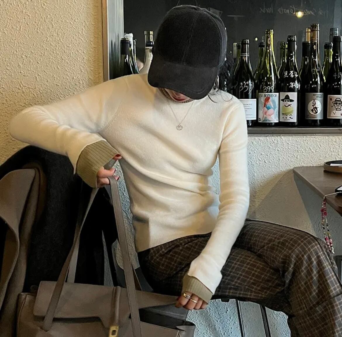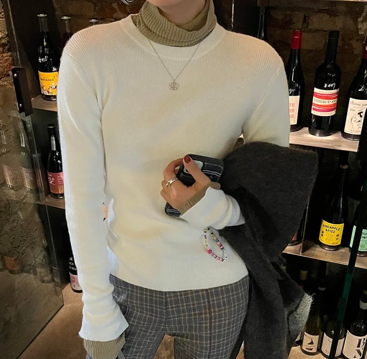 シンプルだけど遊び心あるレイヤード風タートルニット。タイトなフィット感で身体のラインや首元をすっきりと見せてくれるアイテムです。