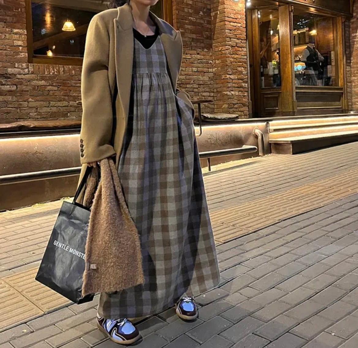起毛感のある素材でシーズンムード漂うチェック柄のロング丈ワンピース。ハイウエストで裾に向かって広がるフレアデザインが、体型をカバーしてスタイルアップが叶います。インに重ね着はもちろん、上からオーバーサイズのトップスを合わせてスカートのようにコーデするのも◎ サイドファスナーで着脱しやすく、ストラップの調節も可能です。