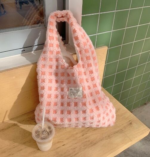 大人気、フリース素材と格子柄がかわいいトートバッグ/エコバッグ。