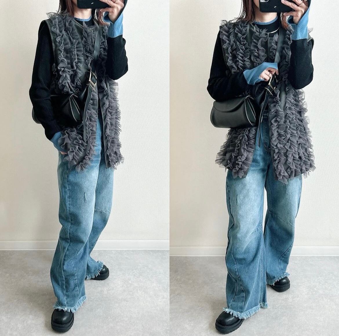 フェミニンな見た目だけど、カジュアルスタイルからお出かけまで、さまざまなコーデに活躍できるフリルのチュールが付いたベストです。