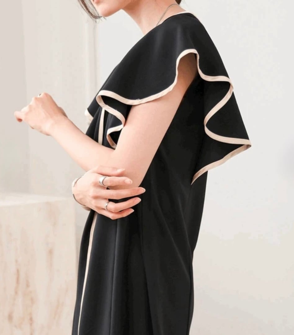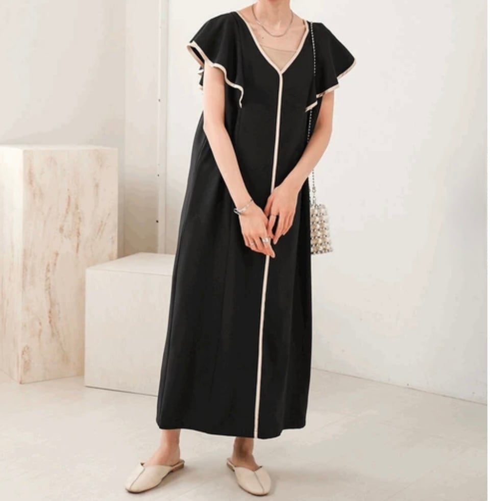 品のあるフリル袖とスタイリッシュな配色パイピングで1枚で存在感を放つワンピースが登場しました。