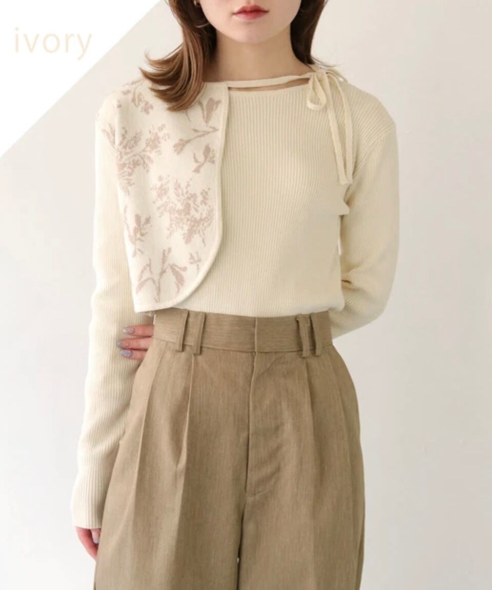 オリジナルジャガード柄を使ったアシンメトリーニットトップス。ジャガード部分の先についている紐を肩で結び留めるデザインです。首元のさりげない肌見せは、女性らしさもUPしてくれます。レイヤードデザインなので、1枚でこなれ感のでるアイテムとなっております。